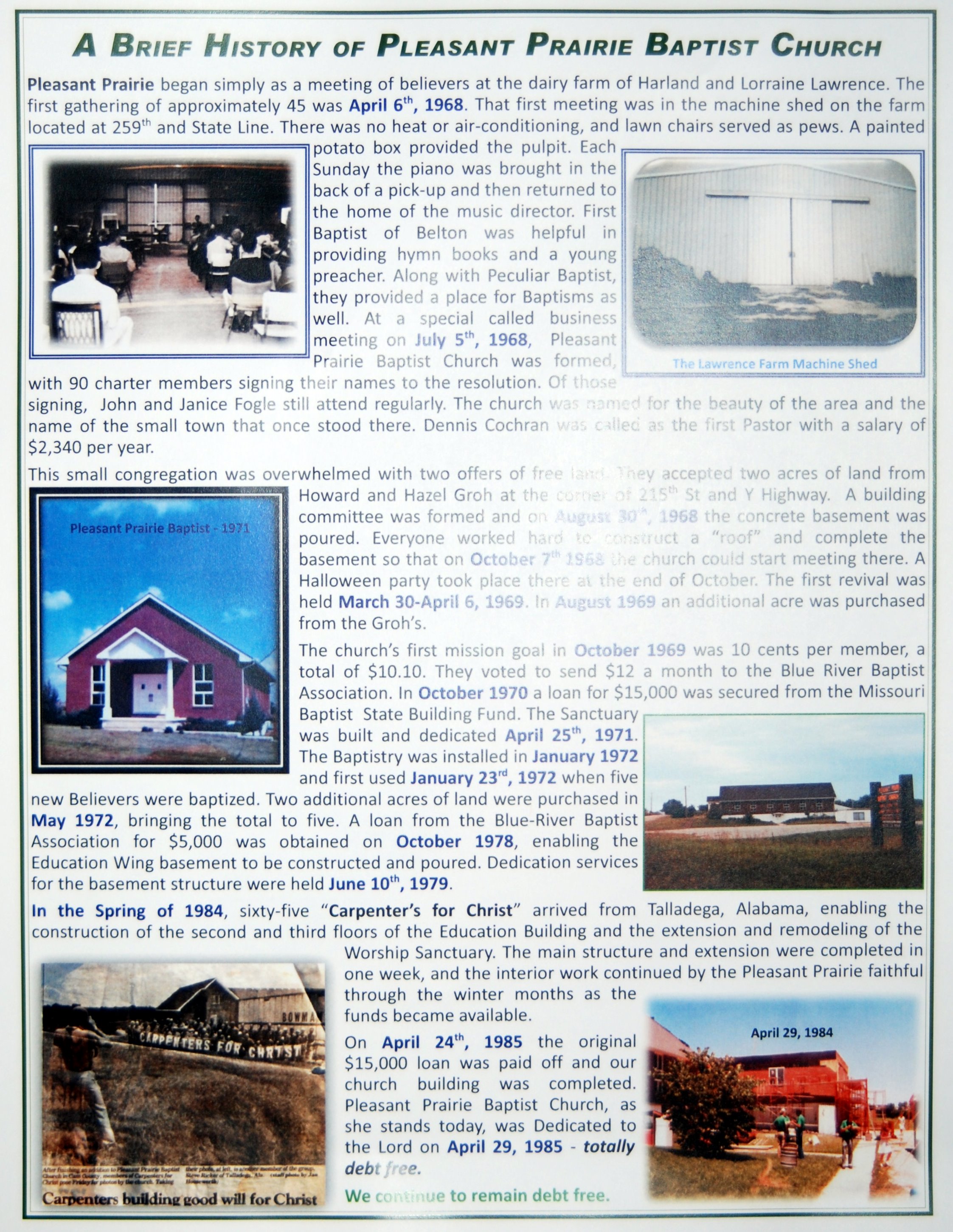 Pleasant Prairie Fortieth AnniversaryWe celebrated Pleasant Prairie Baptist Church’s 40th Anniversary PPBC History pg 1yesterday. I had thought two hours would be sufficient time to herald the past 40 years at Pleasant Prairie Baptist Church. Don’t get me wrong, I get nostalgic from time to time. I even did a video for my wife on our 25th Anniversary (10 years ago-I figure it’s good until our 50th). But actually, I’ve always been a here and now kind of preacher. In fact I’m more a what’s happening tomorrow kind of guy-always looking to the future, never looking back. I’ve always taken Paul’s phrase to heart – “forgetting those things which are behind and reaching forward to those things which are ahead”. As a preacher, if anyone frustrates me, it is Christians that live in the past. You can recognize them by the sighing and the tears when they talk about the “things we used to do”, or they remember how the people “used to do this or that”. But when you ask them about what God is doing NOW they usually get a blank look on their face. Older Christians with multiple “battle scars” seem to be more inclined to this “nostalgia”. Sometimes I believe we focus too much attention and emotion on what might have been. “If only this hadn’t happened, if only that had happened”. Anniversaries are important, and we should take time to honor those who have brought us to this moment in time. But shouldn’t we Honor God most of all?